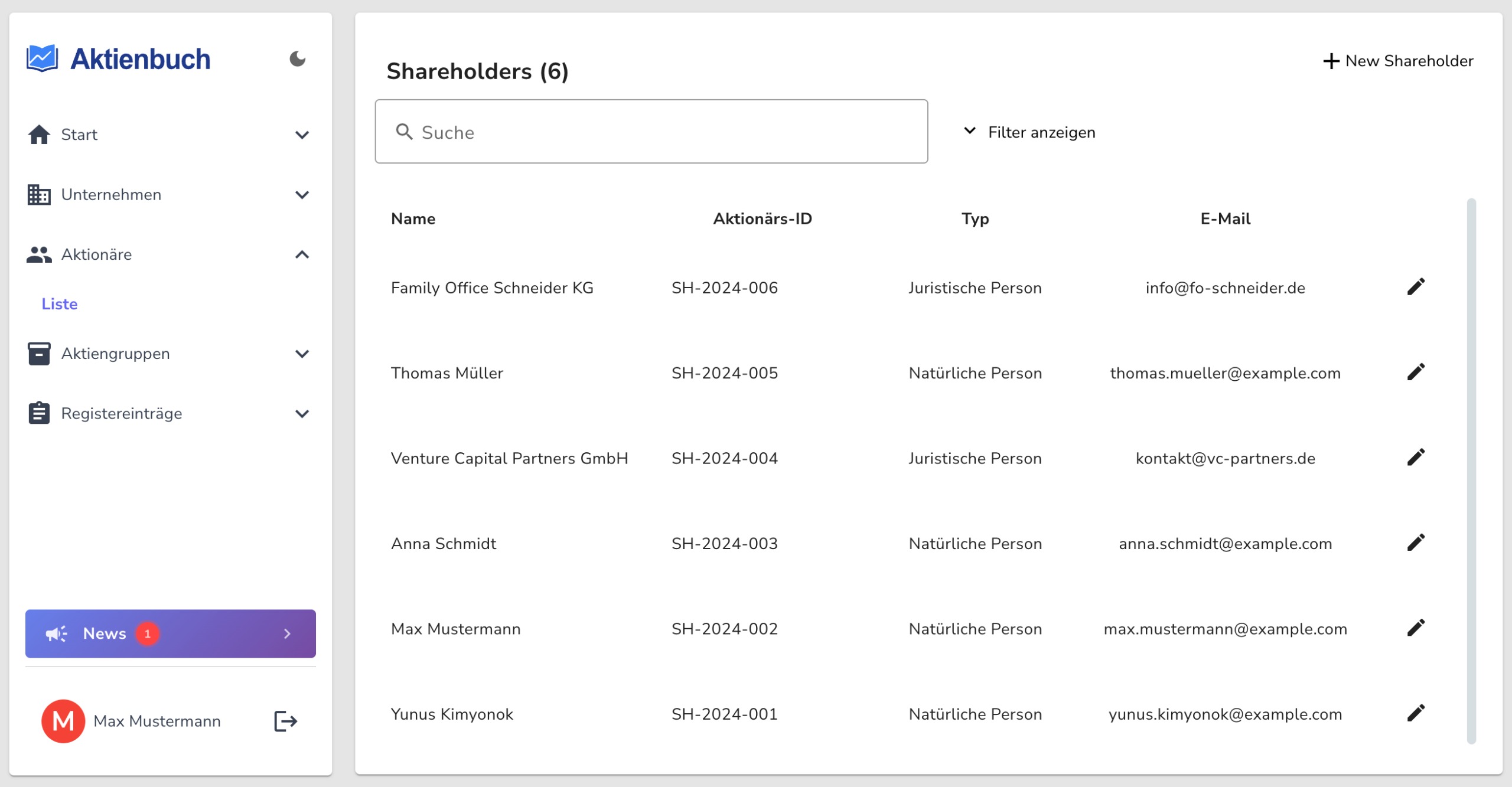 Übersichtliches Dashboard mit allen Aktionären, Aktienbeständen und Transaktionen. Export als PDF oder Excel.